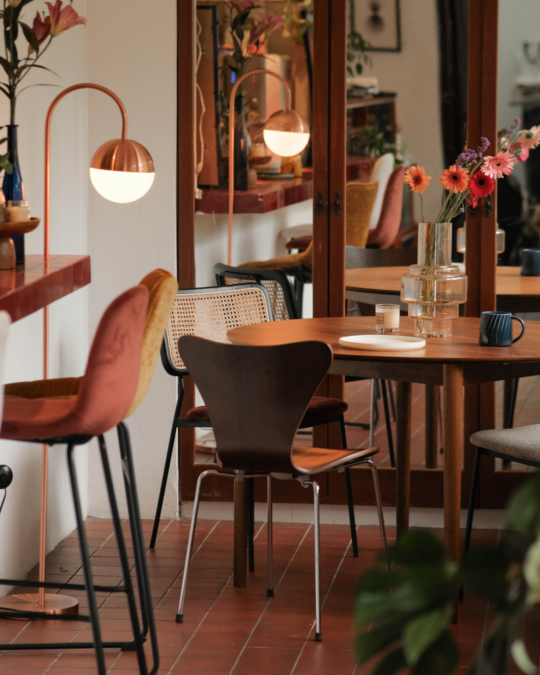 Think vintage furniture paired with bold colors, geometric patterns, and statement lighting.